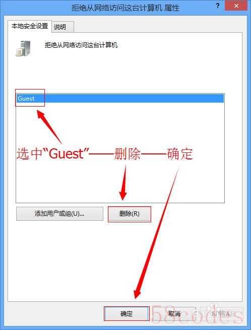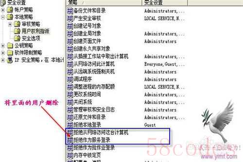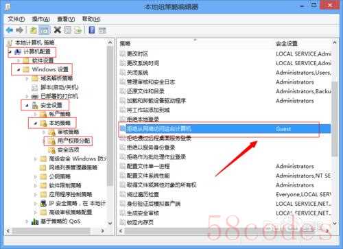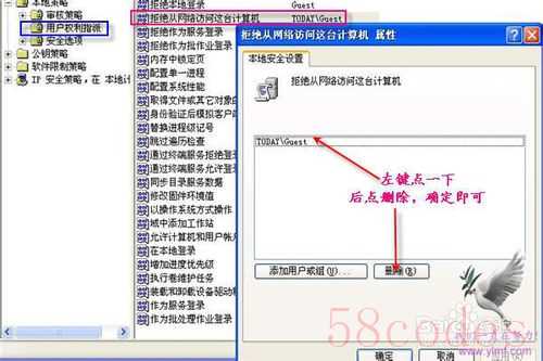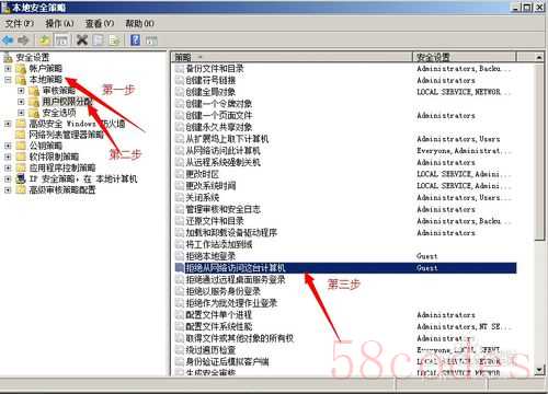 点本地策略—用户权限分配,双击“拒绝从网络访问这台计算机”,如果出现Guest一栏就点删除确定;