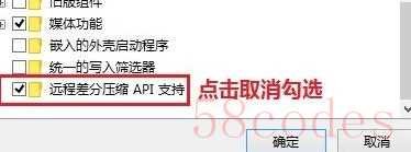 第三步、在Windows功能窗口,找到“远程差分压缩API支持”,取消前面的勾选后,点击确定,随后会出先一个关闭进度提示窗口,别管他,之后需要重启电脑