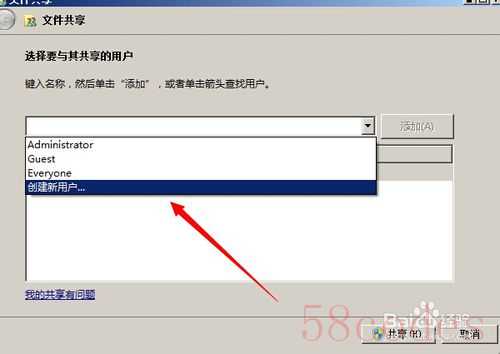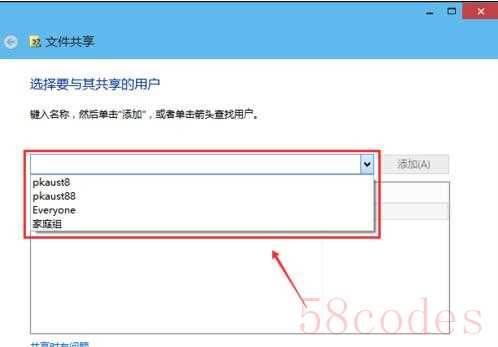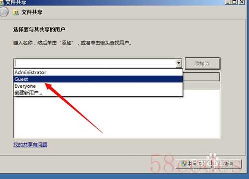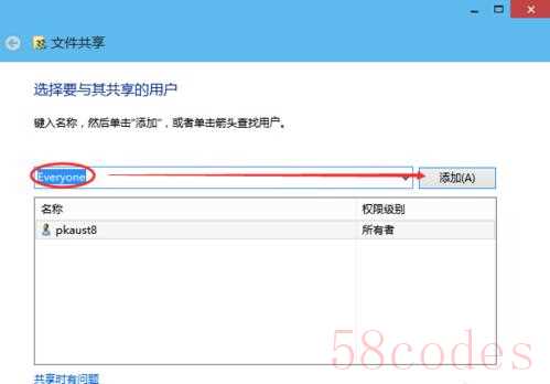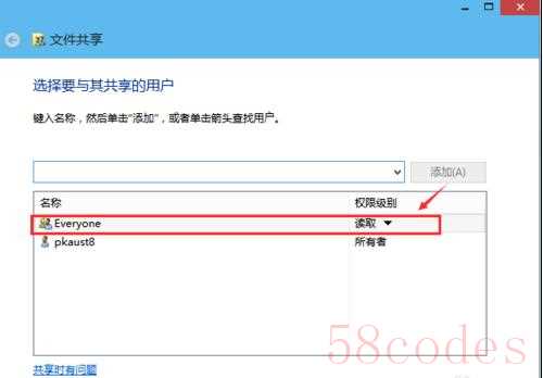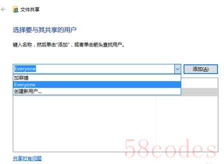 点击后,弹出文件共享窗口,点击下面的向下箭头,可以打开下拉共享用户列表,在列表中选择Everyone,然后点击“添加”。