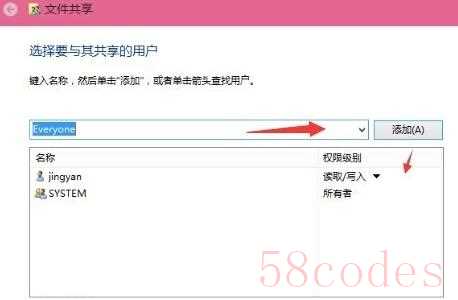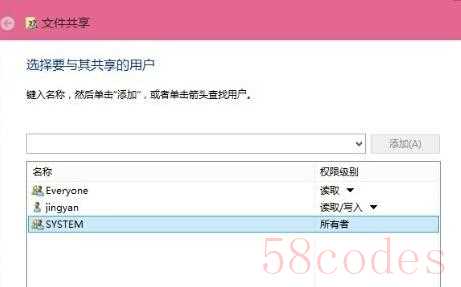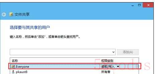 添加你想共享的用户名,如果向所有的用户开放则需要添加【Everyone】这个用户。据需要调整权限级别。