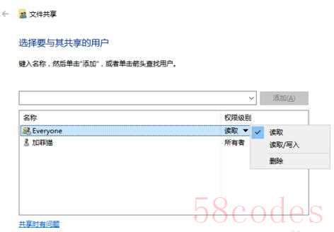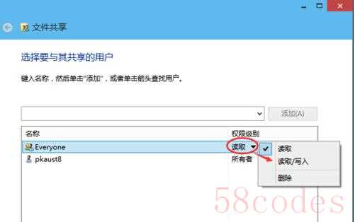 点击后,共享的用户就可以在底下的方框里看到,点击“读取”设置权限(选择“读取”为“只读模式”,选择“读取/写入”表示允许网络用户更改此文件夹中的文件),选择好权限后点击右下角“共享”。
