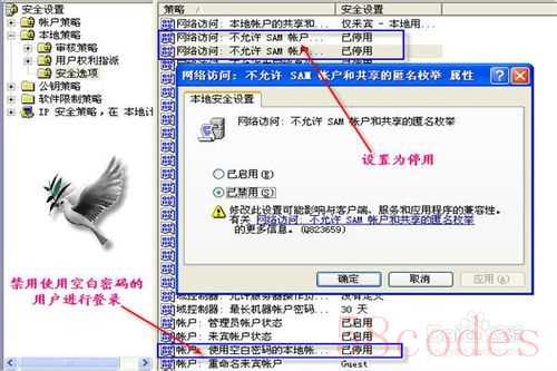 将“网络访问:不允许SAM账户的匿名枚举”停用注意此点只对来宾起效,将在第六章说到。
