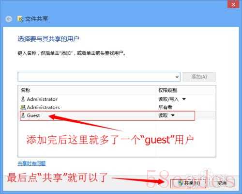 将Guest帐户的权限改为读取/写入,在Guest帐户上读取下拉菜单上更改-----然后就是单击共享。稍等一会,出现完成对话框,单击完成!!