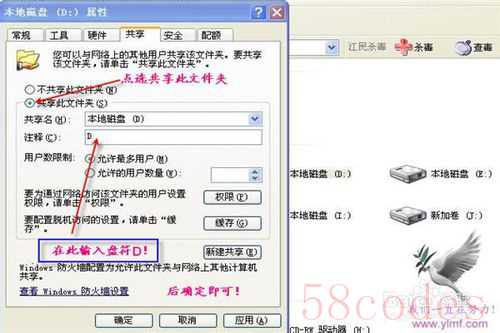 设置共享文件夹或共享盘符(我这里设置D盘为共享盘符,当然你可以自己设置磁盘里面的任意文件夹为共享文件)