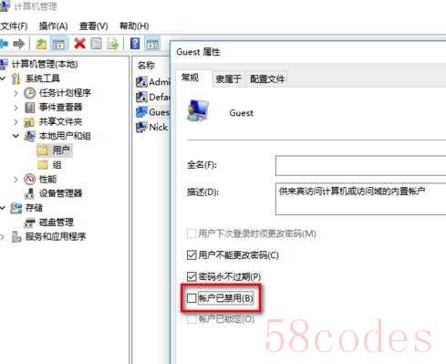 桌面此电脑右键点管理—本地用户和组—用户,双击Guest,把“帐户已禁用”左边的勾去掉。
