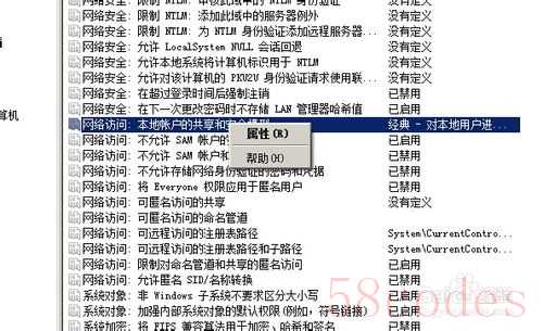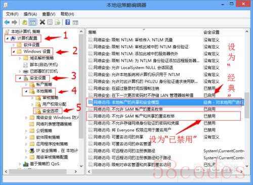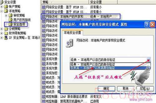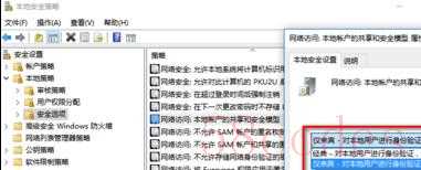 点本地策略—安全选项,双击下面一点的“网络访问:本地帐户的共享和安全模型”,选择“仅来宾”确定。