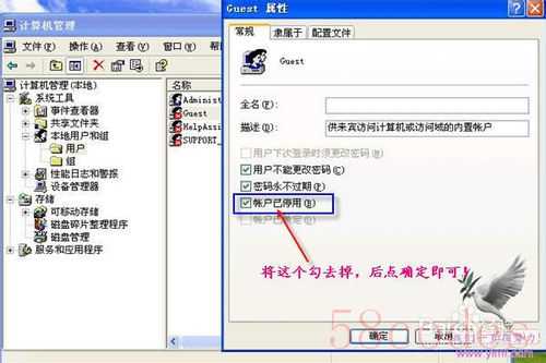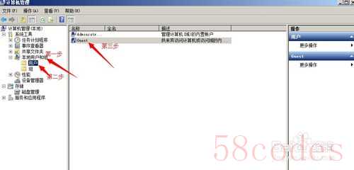“我的电脑”右键-管理-本地用户和组-用户-启用来宾(注意:在这里启用来宾的效果和在控制面板-用户账户里面启用来宾是一样的。区别就是在此启用后面板里面的来宾还是显示没有启用的,而在面板里面启用来宾的话这里也就启用了。)