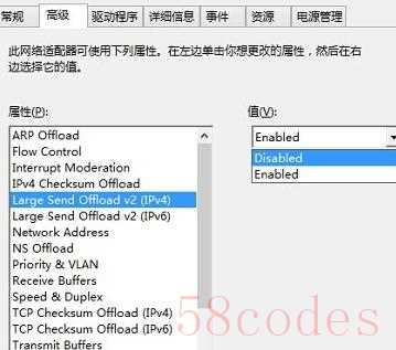 第三步、在网卡属性对话框,点击切换到“高级”选项卡界面,在“属性”列表中,点击选中“Large Send Offload v2(IPv4)”,在窗口右侧,将“值”设置为“Disabled(关闭)”,然后点击底部确定按钮。转载自北海亭www.beihaiting.com