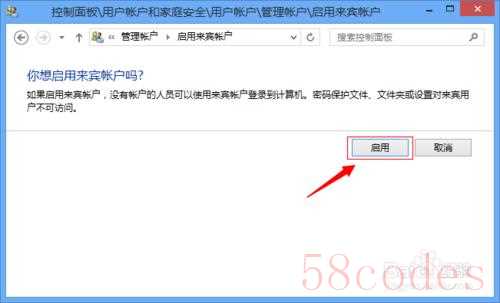 打开"这台电脑"——"计算机"——“打开控制面板”——“用户帐户和家庭安全”——“用户帐户”——“管理其它帐户”——打开“Guest”帐户——“启用”