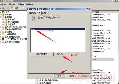 “计第机配置”——“Windows设置”——“安全设置”——“本地策略”——“用户权根分配”——“拒绝从网络访问这台计算机”——删除“guest”帐户