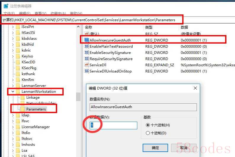 AllowInsecureGuestAuth,把其中的数字0改为1