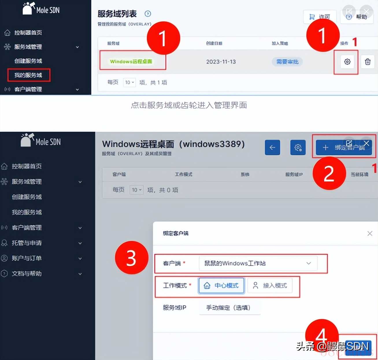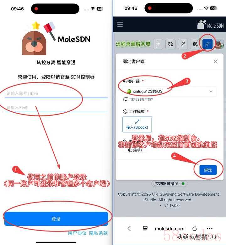 完成后,打开MoleSDN使用先前的账户登录。最后在SDN控制台,将客户端绑定至之前创建的服务域