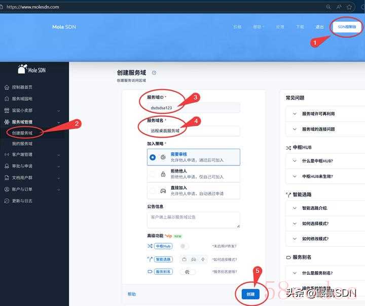 SDN控制台 -> 服务域管理 -> 创建服务域