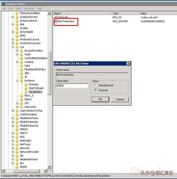 4.找到“HKLMSystemCurrentControlSetControlLsaKerberosParameters”,添加键值“MaxTokenSize”,类型为“REG_DWORD”,值为“48000 (Decimal)”。