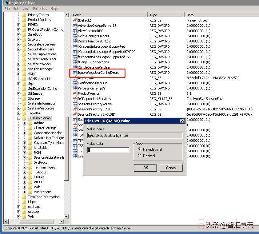 3.找到“HKEY_LOCAL_MACHINESYSTEMCurrentControlSetControlTerminal Server”,添加键值“IgnoreRegUserConfigErrors”,类型为“REG_DWORD”,值设置为1。