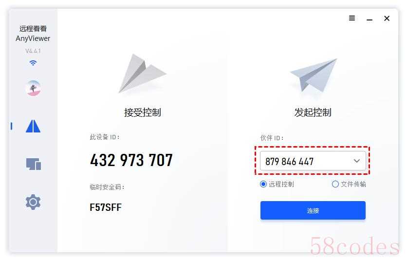 步骤1. 在两台计算机上安装并打开远程看看软件,在控制端输入被控端的设备ID,然后点击“连接”。