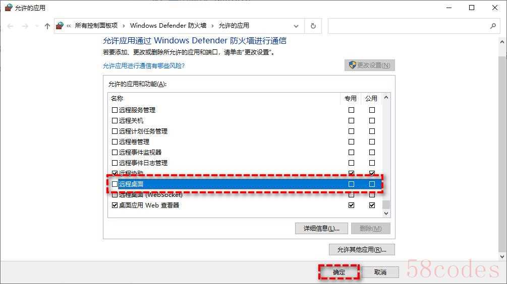 步骤2. 确保“远程桌面”已经被允许通过Windows防火墙。如果没有,请点击右上角的“更改设置”选项,勾选“远程桌面”,然后点击“确定”。
