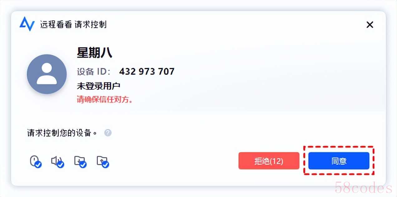 步骤3. 此时被控端将收到一个控制请求弹窗,点击“同意”即可快速建立远程连接。