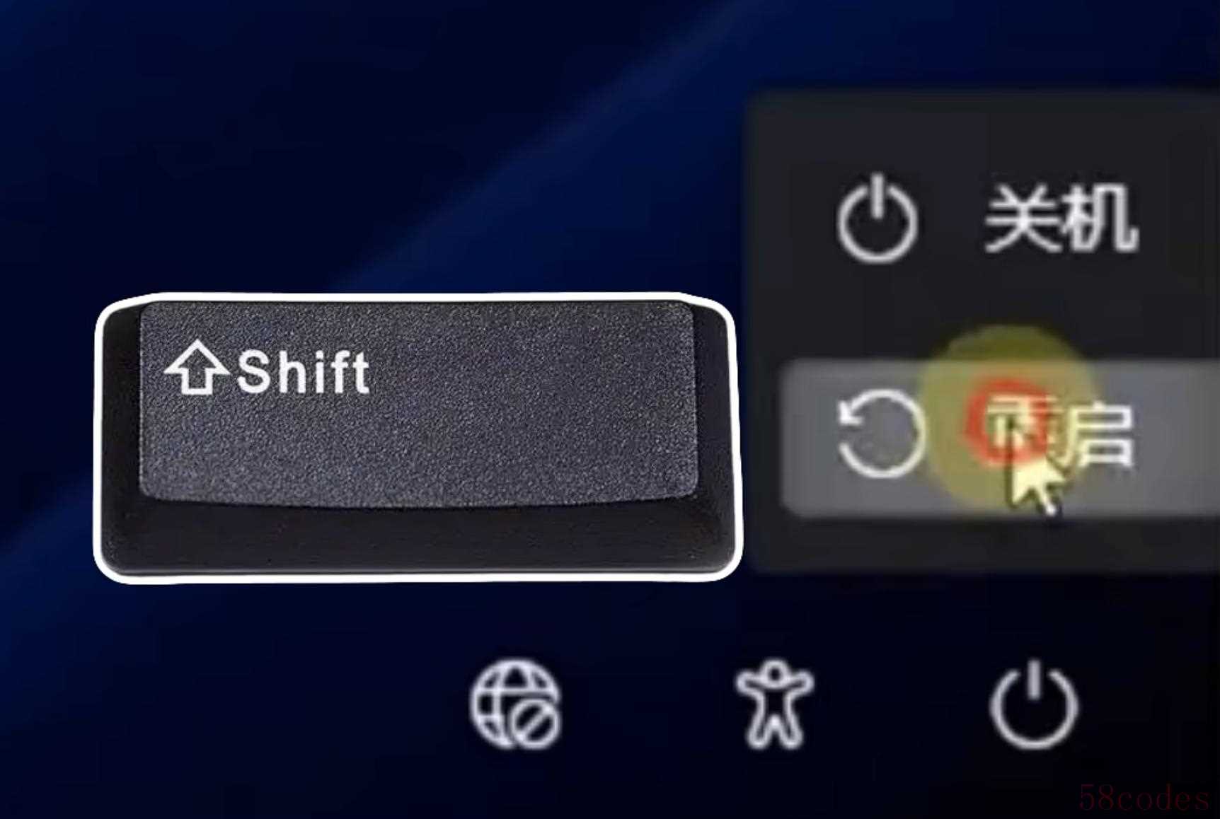 - 同时点击屏幕右下角的「电源按钮」→选择「重启」