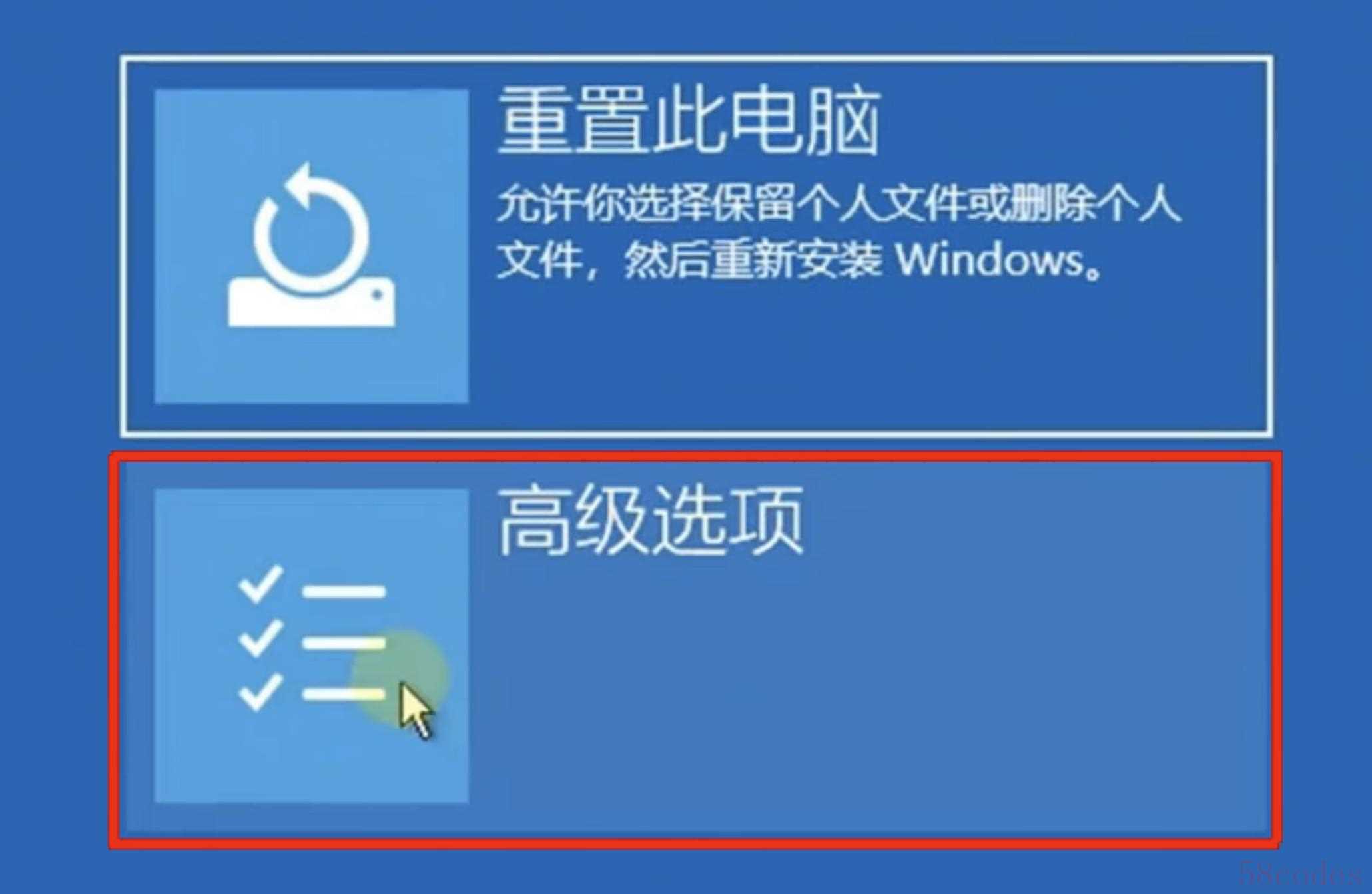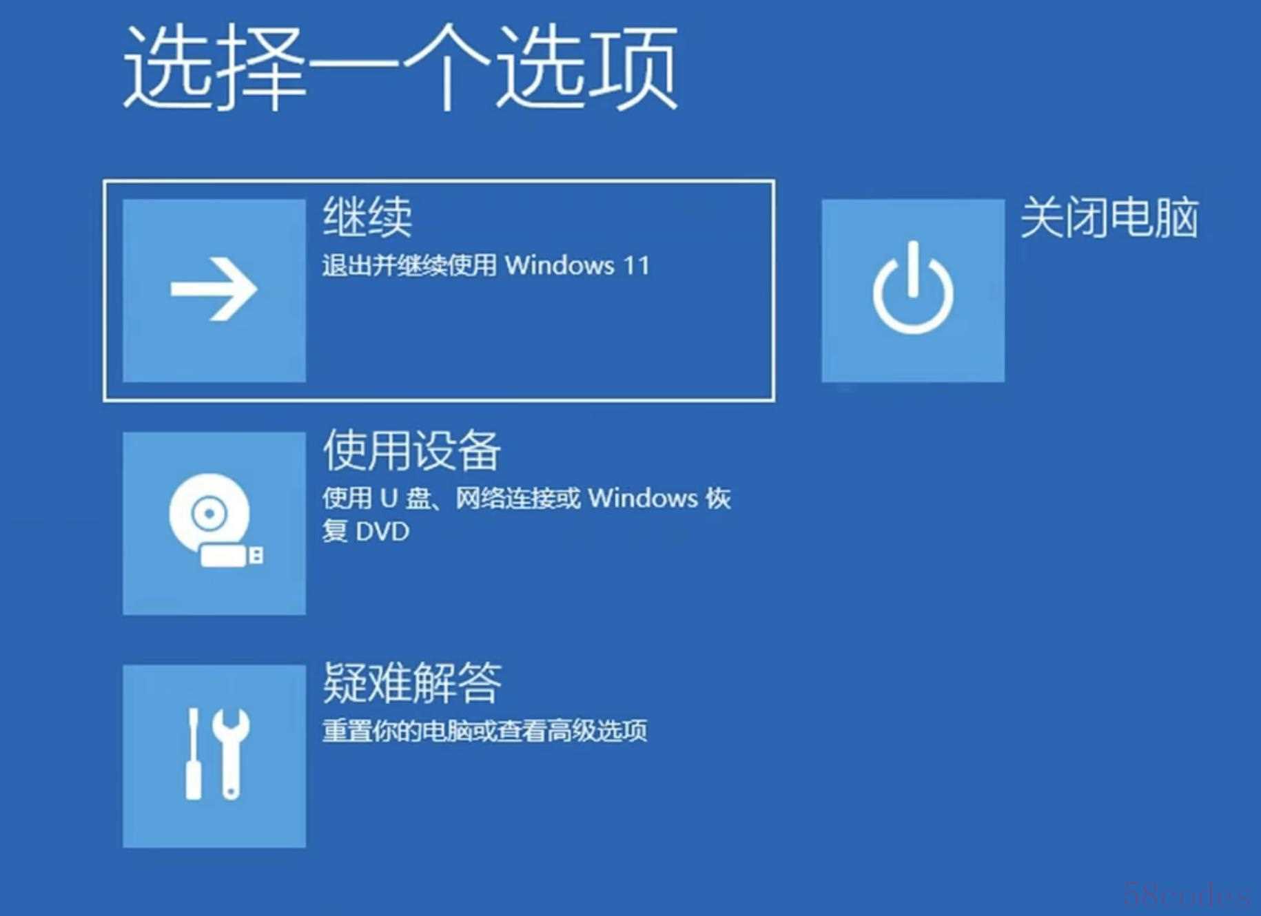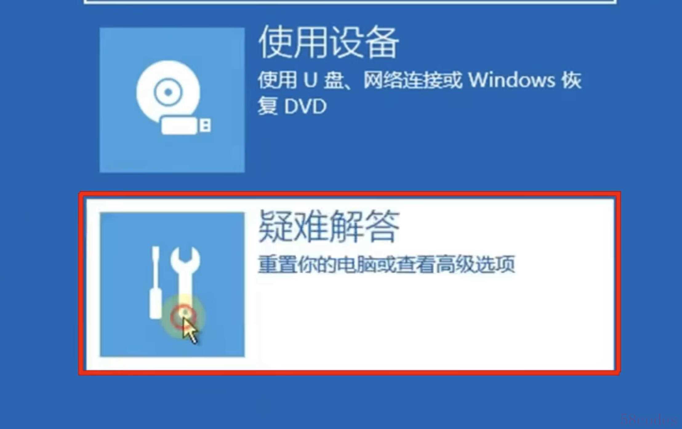 - 电脑重启后会进入蓝色背景的「选择一个选项」界面,点击「疑难解答」