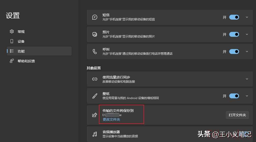 - 在「手机连接」应用上可以设置传输文件保存地址,以防C盘爆满。