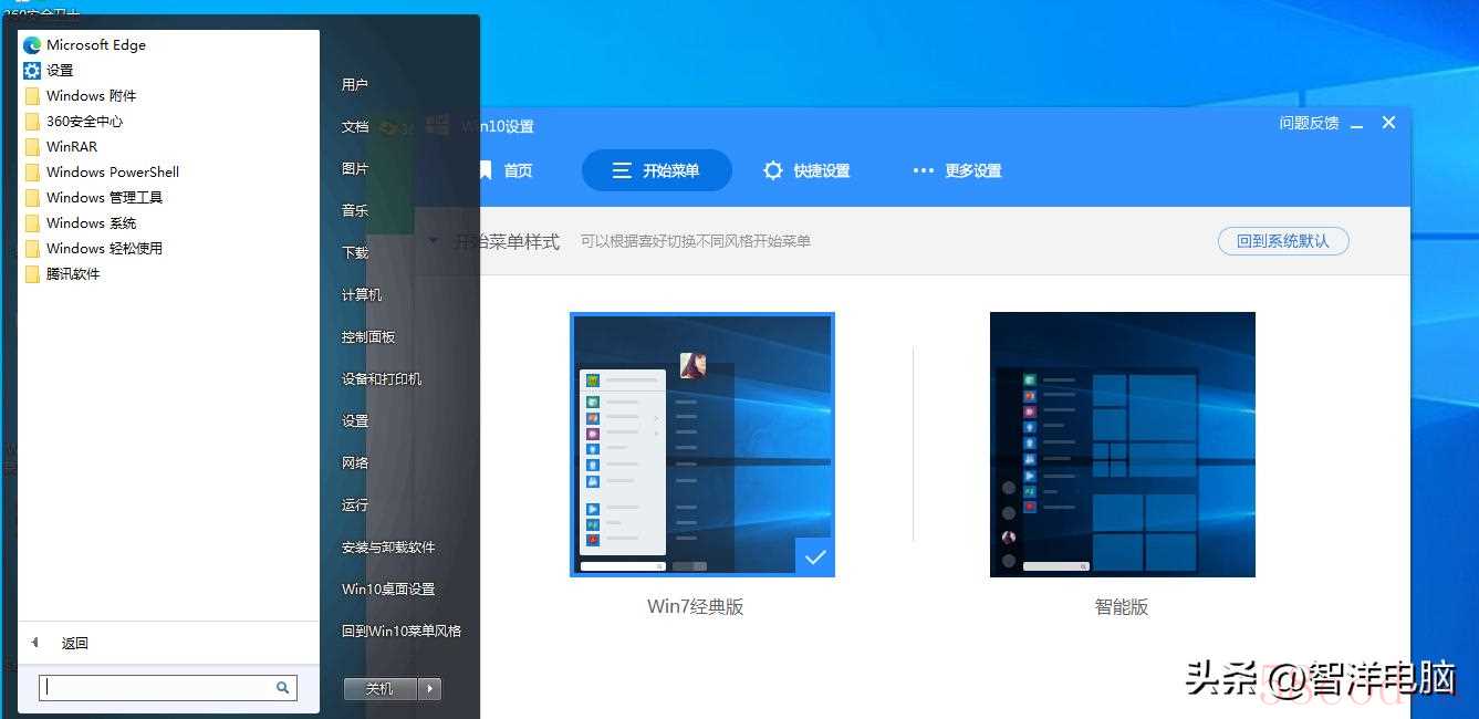 一键设置好以后他默认开始菜单是智能版本的,虽然比WIN10的好看点,但是还没有WIN7的经典,我们需要去改成Win7经典版的。