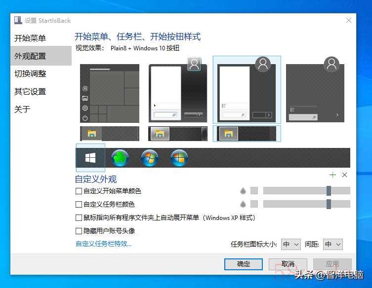 设置里面有,开始菜单,外观配置,切换配置,其他设置等等根据自己喜好设置就好。