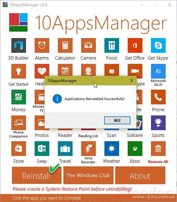 系统内置的应用卸载之后,如果需要重新安装应用,单击软件界面中的Reinstall按钮,软件开始自动恢复安装原有的应用,安装结束后显示提示框,显示安装成功(图3)。