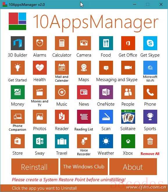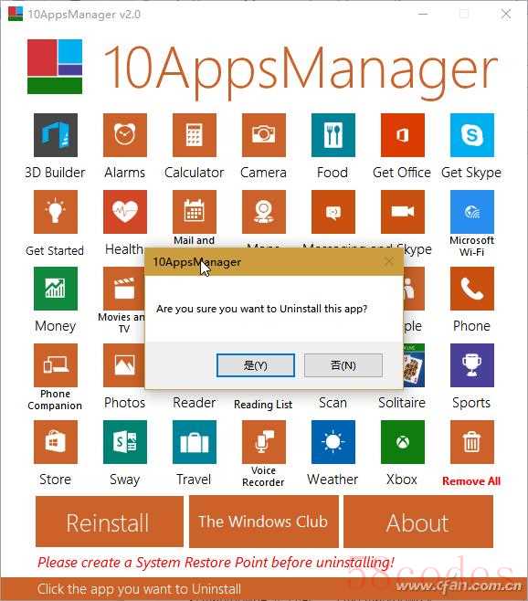 首先,在运行10AppsManager软件,出现APP管理界面之后,可以看到系统中已经安装的所有APP的列表。软件在状态栏的上方以红色字体提醒用户,在卸载应用之前做好系统还原点的建立工作,以防不测时恢复系统(图1)。