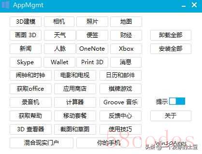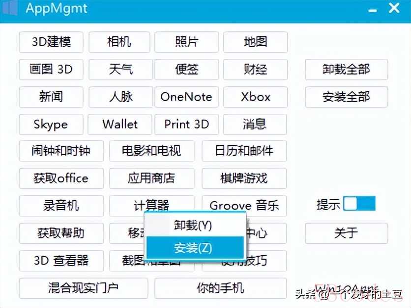 这个工具可以一次性全部卸载上面列出来的预装应用。可以先卸载全部,然后根据自己的需要再单独安装。比如要单独安装计算器,可以点击计算器,然后选择安装,如下图所示