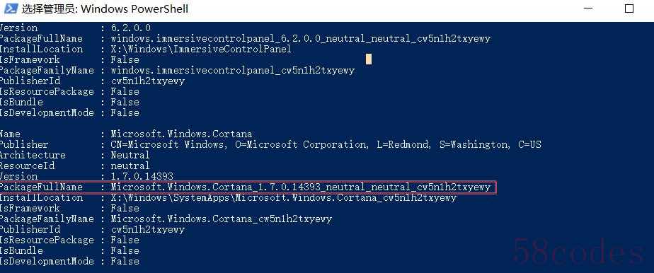 3、找到要卸载应用的英文名称,记下其中PackageFullName的值,比如比如智能助手Cortana小娜对应的是: