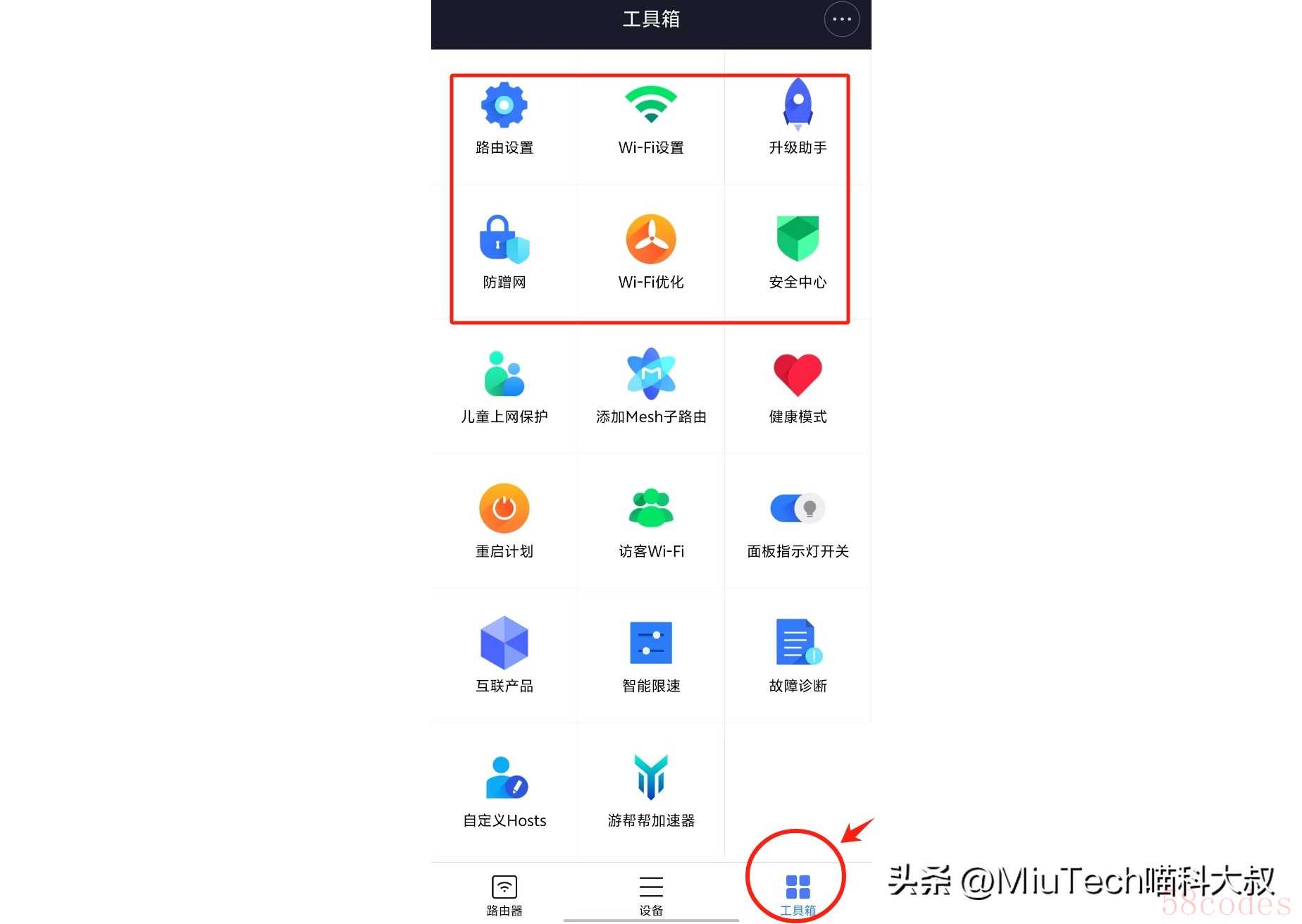 点击工具箱,可以看到里面除了有路由器设置、WiFi设置、设备升级等常见选项,还有其他不怎么常用,但也能在需要时派上用场的选项,根据自己的需求来设置就好。