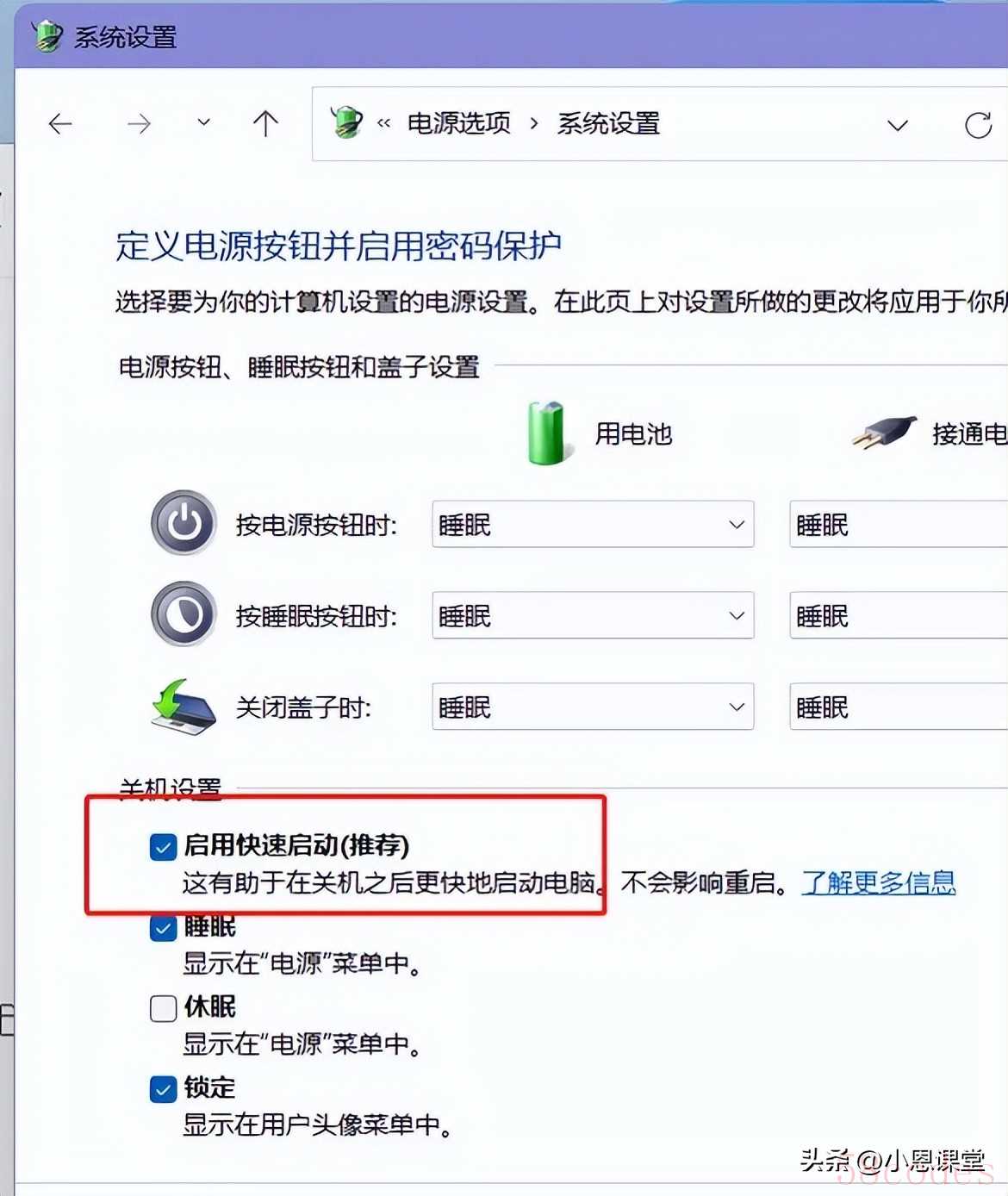 5、就能看见画面中出现【使用快速启动】选项,我们在后面取消勾选即可。