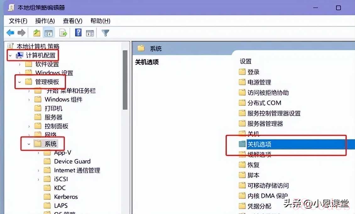 2、在进入的本地策略编辑器当中,左侧菜单栏里选择【计算机配置】-【管理模板】-【系统】,然后鼠标移动右侧,下滑找到并双击【关机选项】;