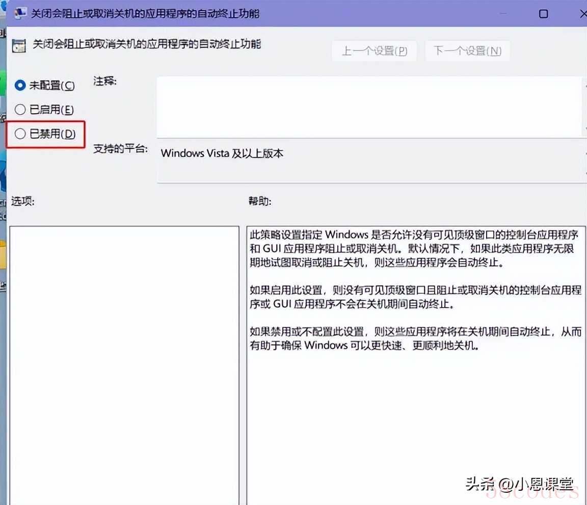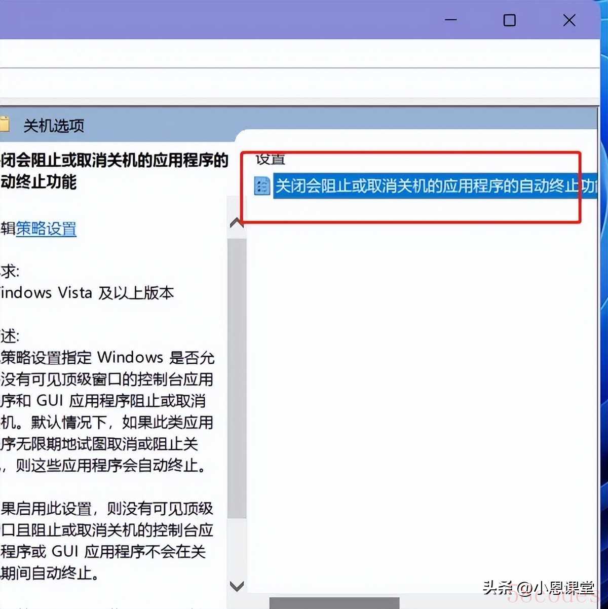 3、接着我们就能在右侧窗口配置栏当中看见【关闭会阻止或取消关机的应用程序的自动终止功能】,点击打开;