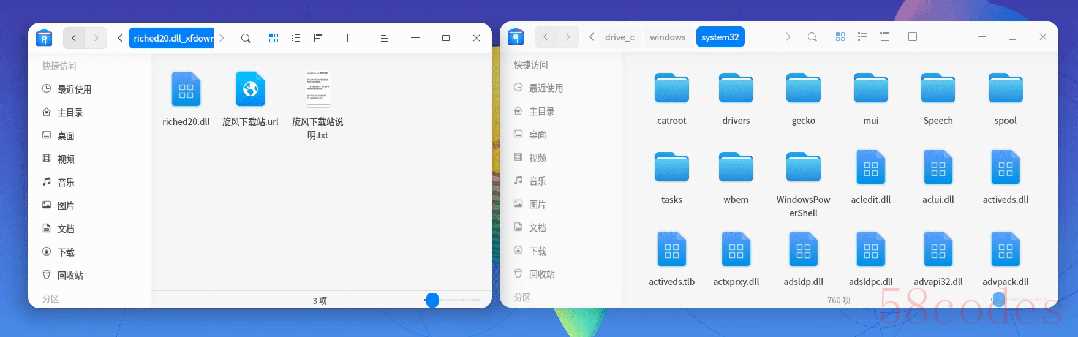 将原生的 riched20.dll 复制到容器 C 盘下方的 windows/system32 目录下: