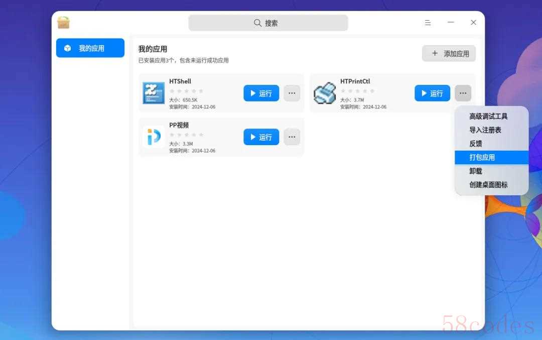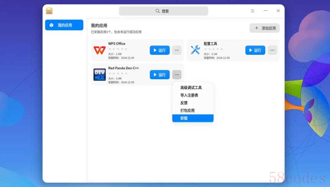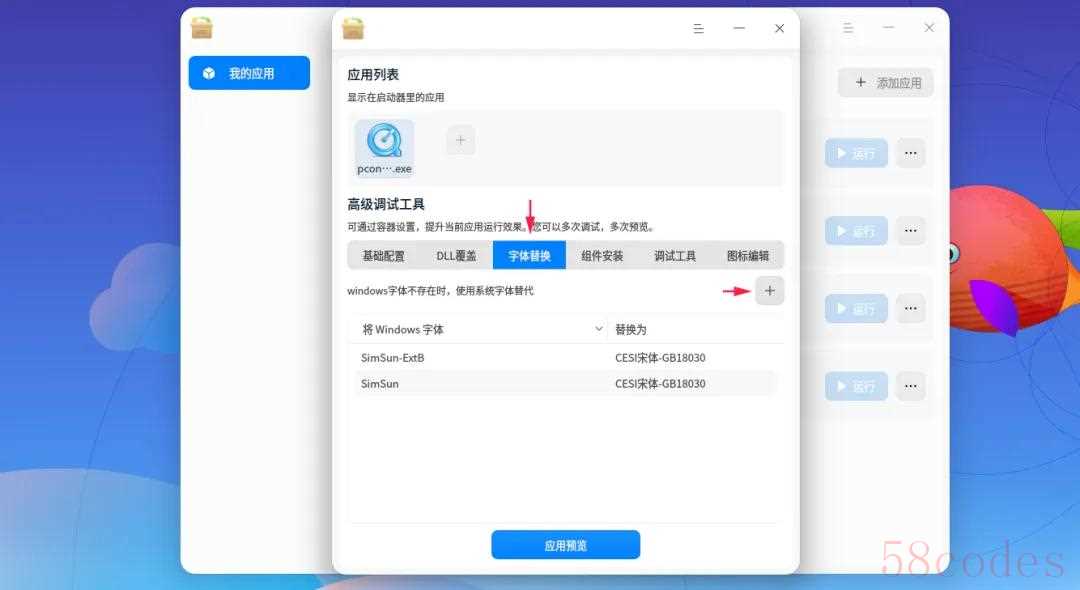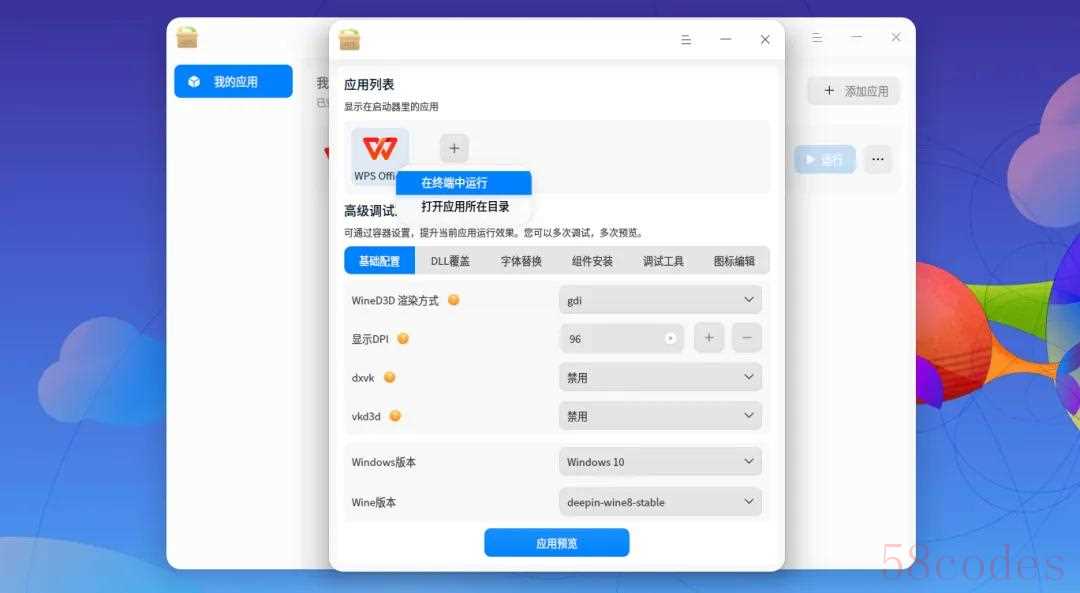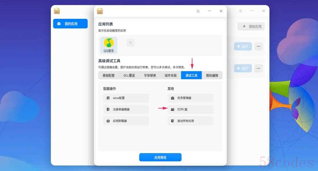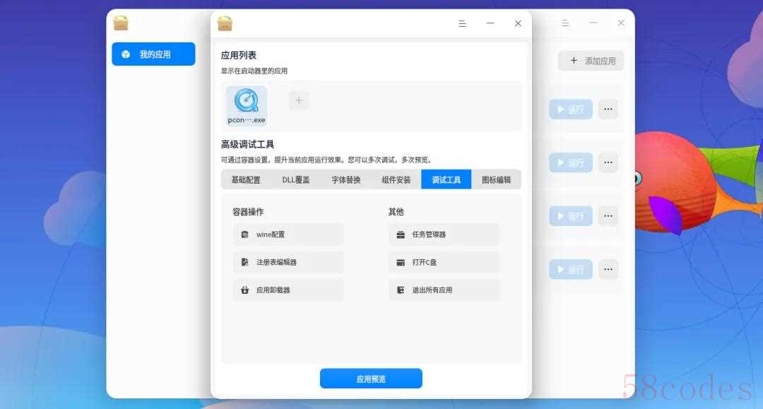 现在的兼容引擎在每次双击、添加 exe 的时候都会单独创建一个隔离的环境(容器)。如果需要在已经创建的容器中运行安装程序,可以在高级配置中选择“调试工具”、单击“应用卸载器”: