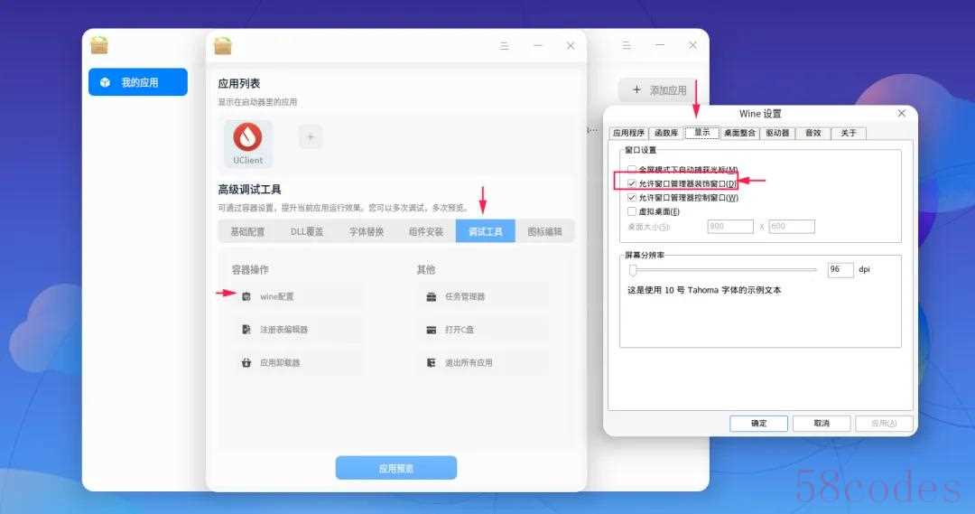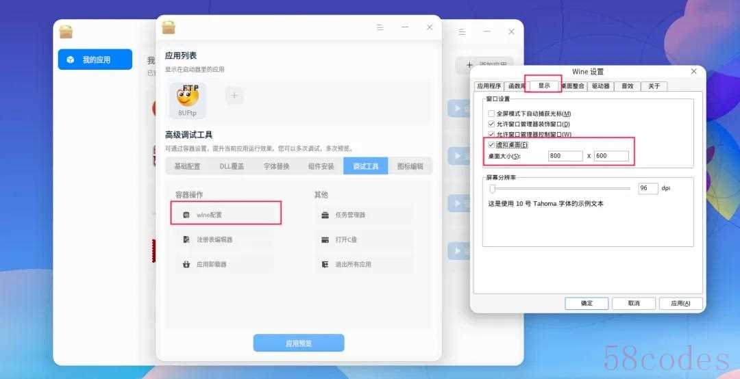 在 wine 设置勾选虚拟桌面,可以将应用显示在单独的窗口中,如果某个全屏应用无法使用,这个设置可以将应用放到窗口里: