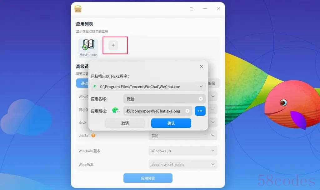 安装程序安装完成后,重新打开高级配置,可以在应用列表的“+”号按钮里添加安装的 EXE: