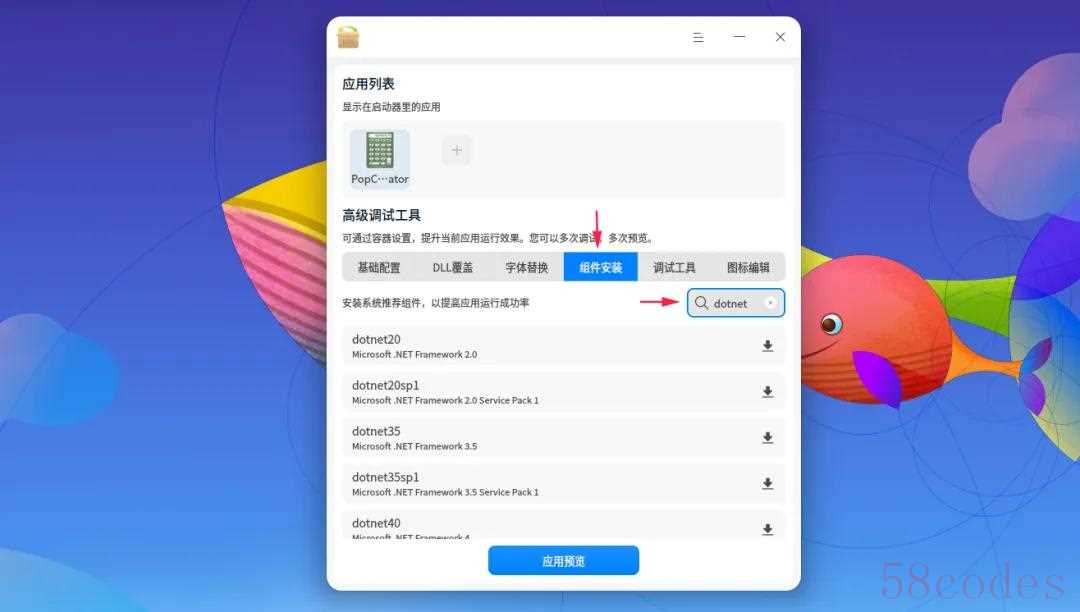 这是因为应用缺失了 dll,而这些 dll 在当前版本的 wine 还没有实现。这时候可以在“安装组件”里搜索 dll 的名字,看是否能够通过组件安装 dll:
