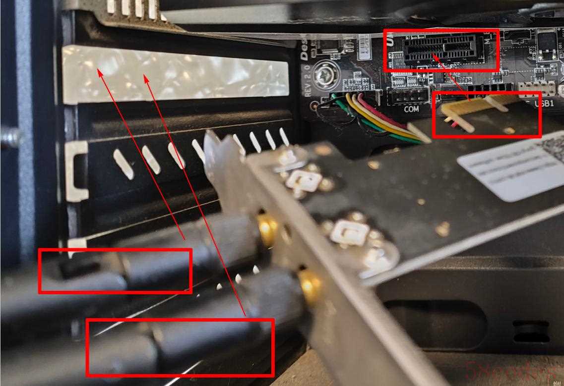 - 安装网卡:将天线穿过机箱后部挡板。无线网卡的金手指对准PCIEX1_2插槽,轻轻插入并固定好。