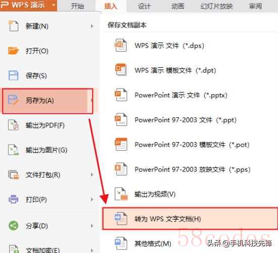 第一步:首先我们随便打开一个PPT,找到【另存为】,选择【转为WPS文字文档】