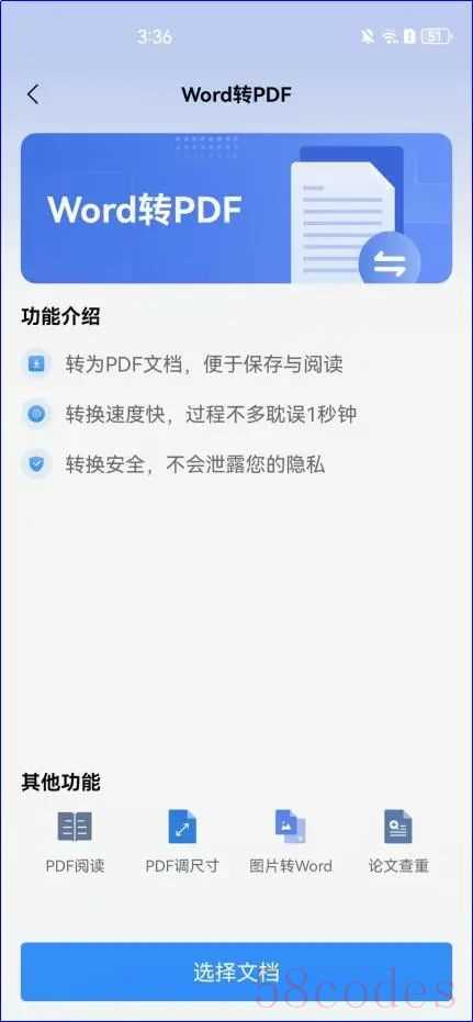 接着点击【选择文档】按钮,从文件库中导入需要转换的word文件即可转换格式!
