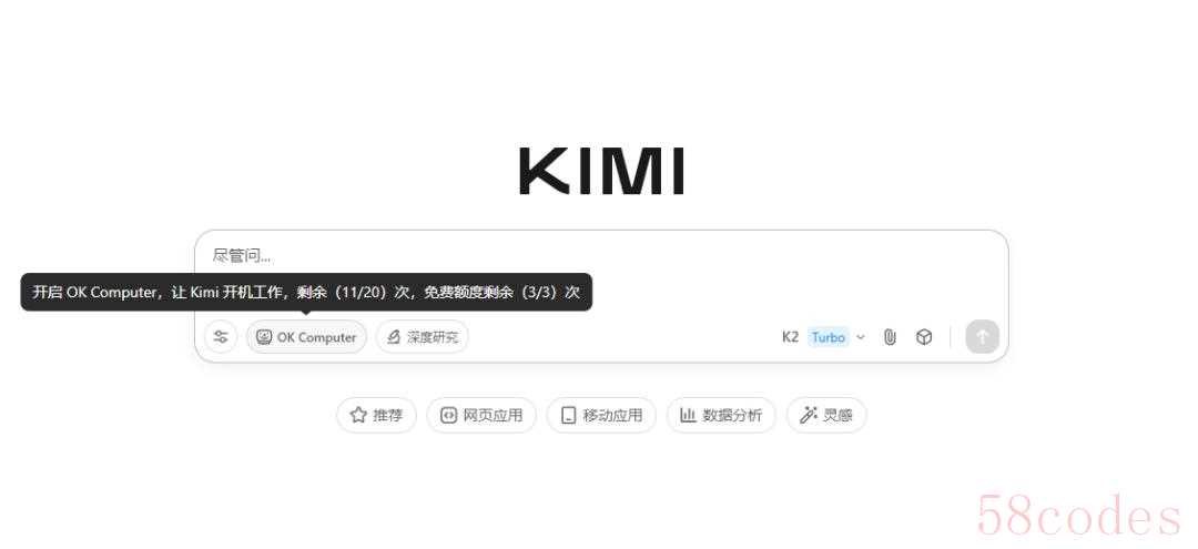 打开Kimi官网kimi.com,勾选“OK Computer”,就可以使用了(也可以看到自己的使用额度)。