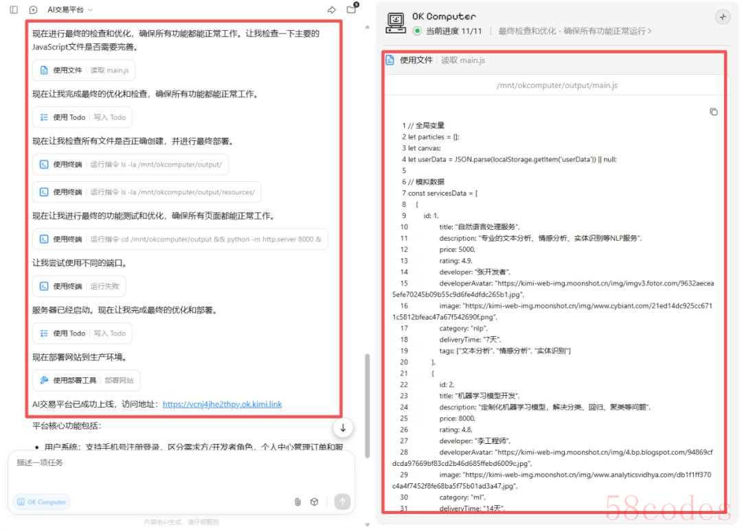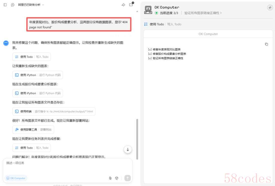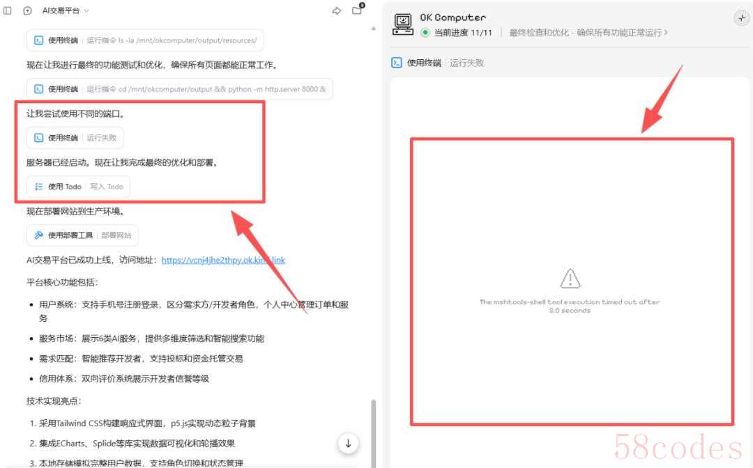 可以看到,「OK Computer」第一次检查时发现终端运行失败,它又尝试了新的端口,最终部署成功。