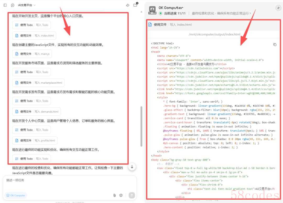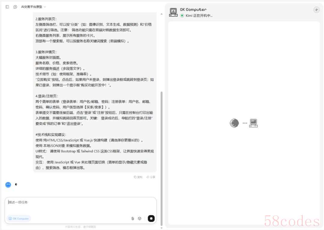 前几天,在云栖大会上看到一个很有意思的产品,叫“AI交易所”(一个撮合AI需求方和开发者的平台)。我试试,看能不能用「OK Computer」把网站原型做出来。