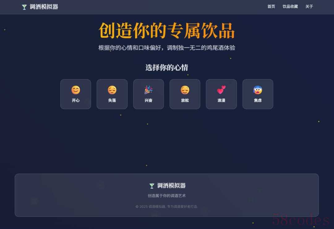 帮我做一个调酒模拟器,用户可以选择调酒材料,自己的心情(如:开心、失落等),以及想要的口味(如:偏甜、果味浓),就能创造一款专属饮品,体验调酒的乐趣。