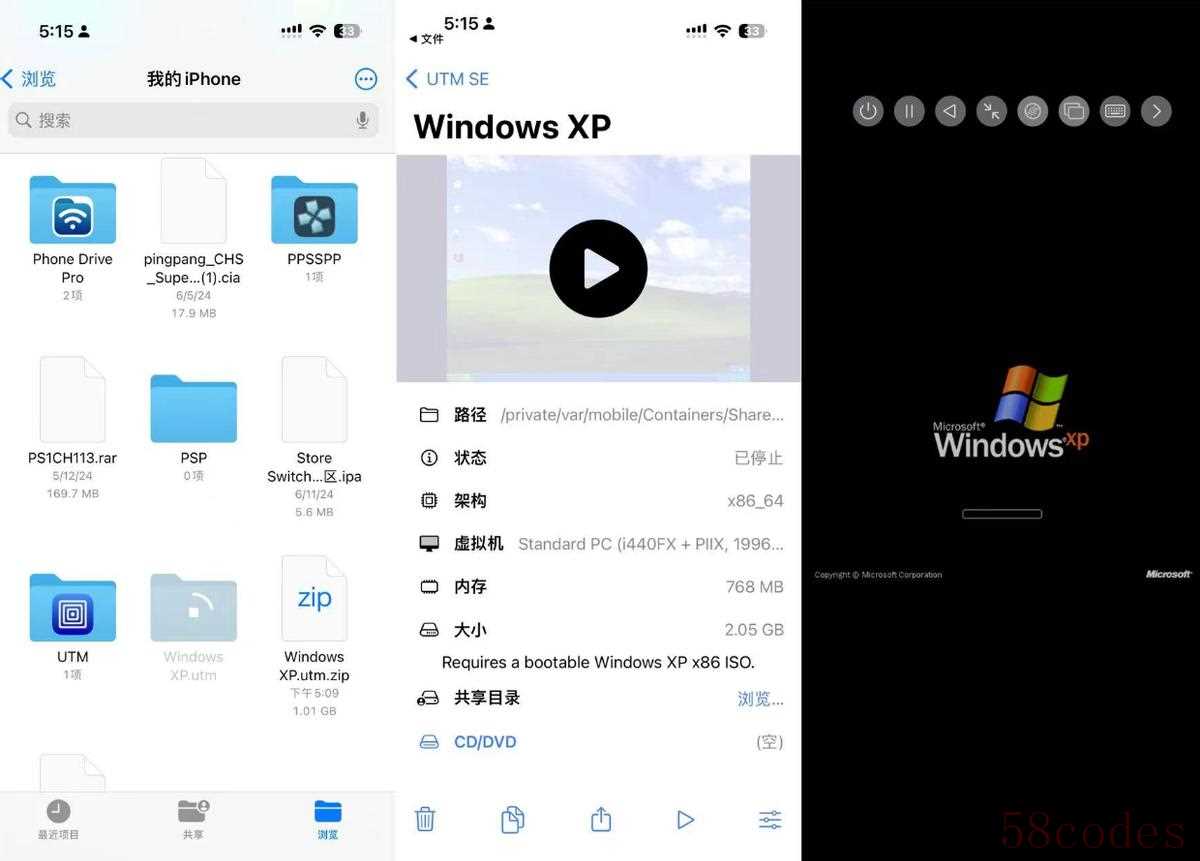 1,UTM SE相比完整版UTM(需越狱、巨魔安装),性能有一定的衰减,顶多只能运行XP。最好是6GB以上运存,同时要准备20GB左右的空间(话虽如此,但8GB的iPhone 15 Pro依然会显示运存不足)。