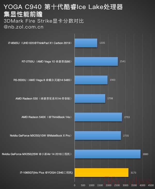 YOGA C740和C940虽然都是采用的第十代酷睿处理器,但它们却采用的两种不同制程。YOGA C940采用的是10nm的Ice Lake处理器,它重点提升了集成显卡的性能。在笔者测试的顶配版机型上(i7-1065G7处理器,16GB内存,1TB SSD),Iris® Plus集显在3DMark Fire Strike的跑分已经大幅领先于普通集成显卡的性能,甚至已经超越大部分的入门级独立显卡,但处理器的性能仍然维持在上一代的水平。