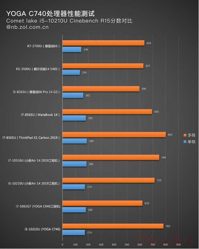 而YOGA C740则采用的是14nm成熟工艺的Comet Lake处理器,它的集成显卡与上一代保持一致,但CPU性能有了极大提升,同时在C740上这颗处理器还有很强的性能释放,大家可以通过下面的表格来对比C740、C940和其他同级别轻薄本的处理器性能。